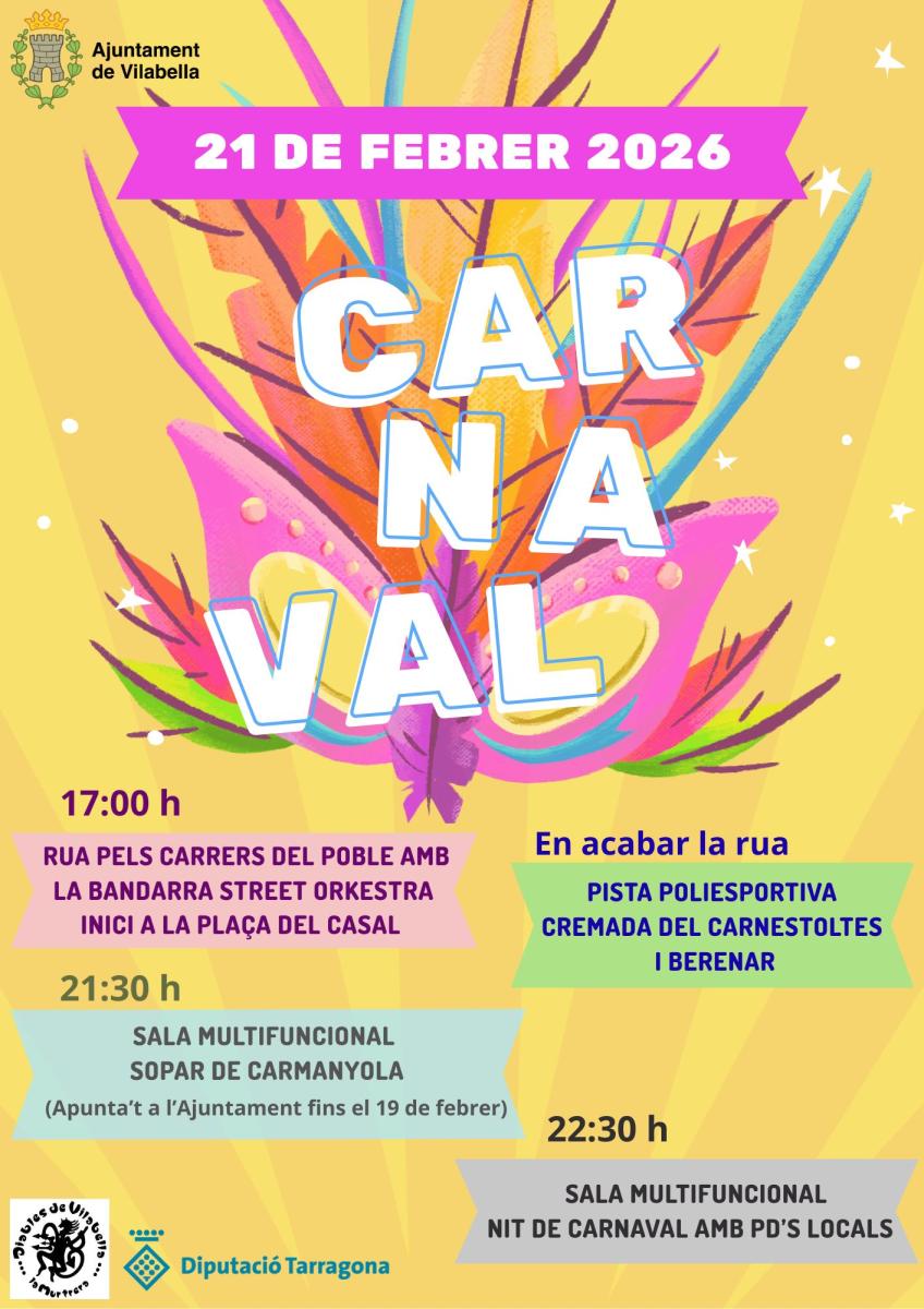 Vilabella es prepara per viure una nova edició del Carnaval el pròxim dissabte 21 de febrer, una de les festes més esperades i esbojarrades de l'any. La festa arrencarà a les 17 hores amb la rua de disfresses, que sortirà des de la plaça del Casal i recorrerà diversos carrers i places de la vila. La rua estarà amenitzada per la música i l’animació de La Bandarra Street Orkestra, que posarà ritme i bon ambient.